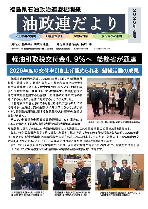 福島県石油政治連盟の「油政連だより」は、年4回発行しています。下記に掲載しましたPDFをダウンロードしてご覧ください。